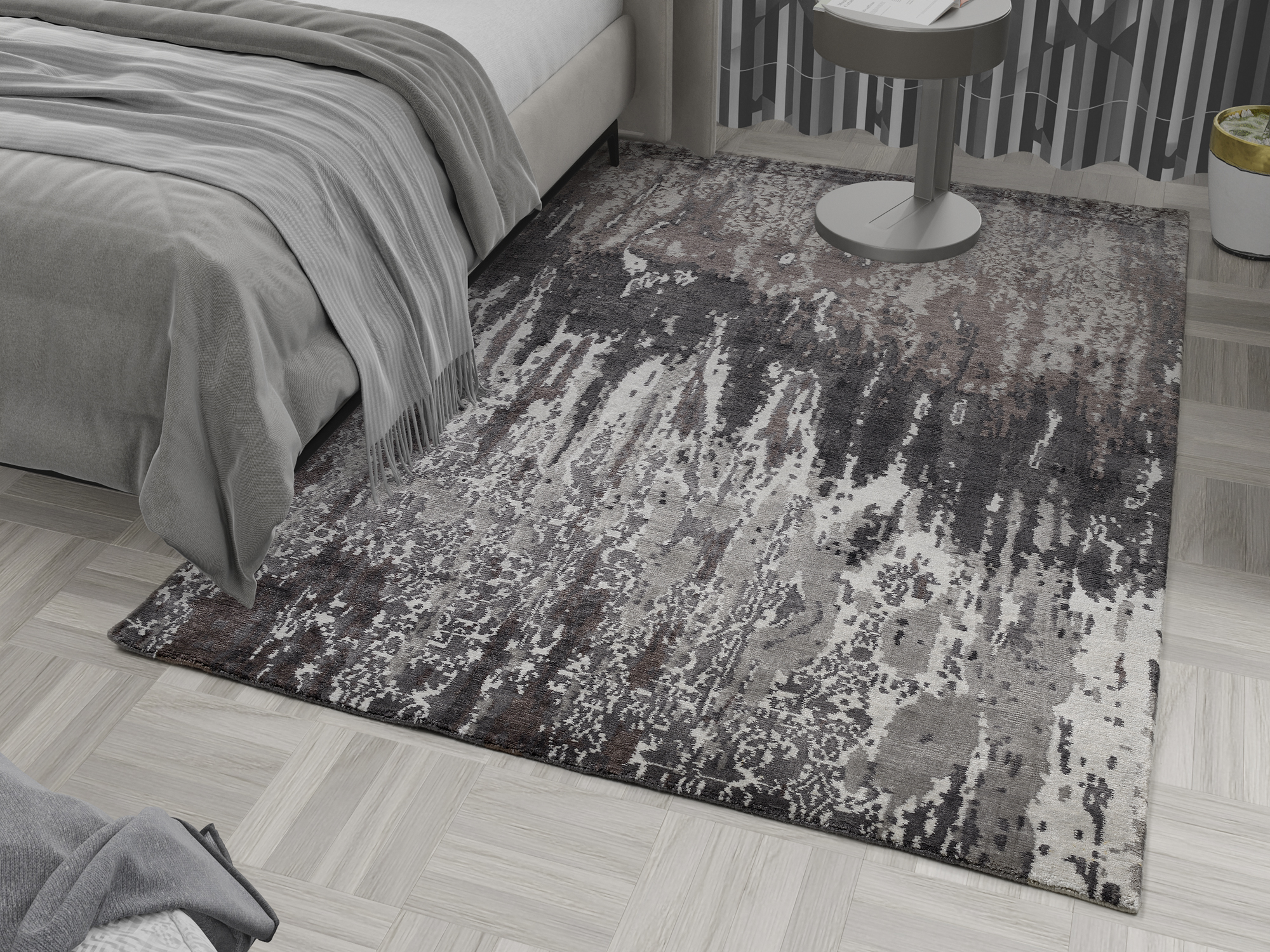 ist ein besonders aufwendiger Design-Teppich mit über 120.000 Knoten/m². Er überzeugt durch äußerst feine Handknüpfkunst, die sich in ausgezeichneter Qualität und edler Musterung widerspiegelt. Die hochwertige Viskose erzeugt in den prächtigen Kolorierungen angenehmen Glanz und samtweiche Oberflächenstruktur. Behagliche Gemütlichkeit und elegante Extravaganz für Ihren Wohnraum!